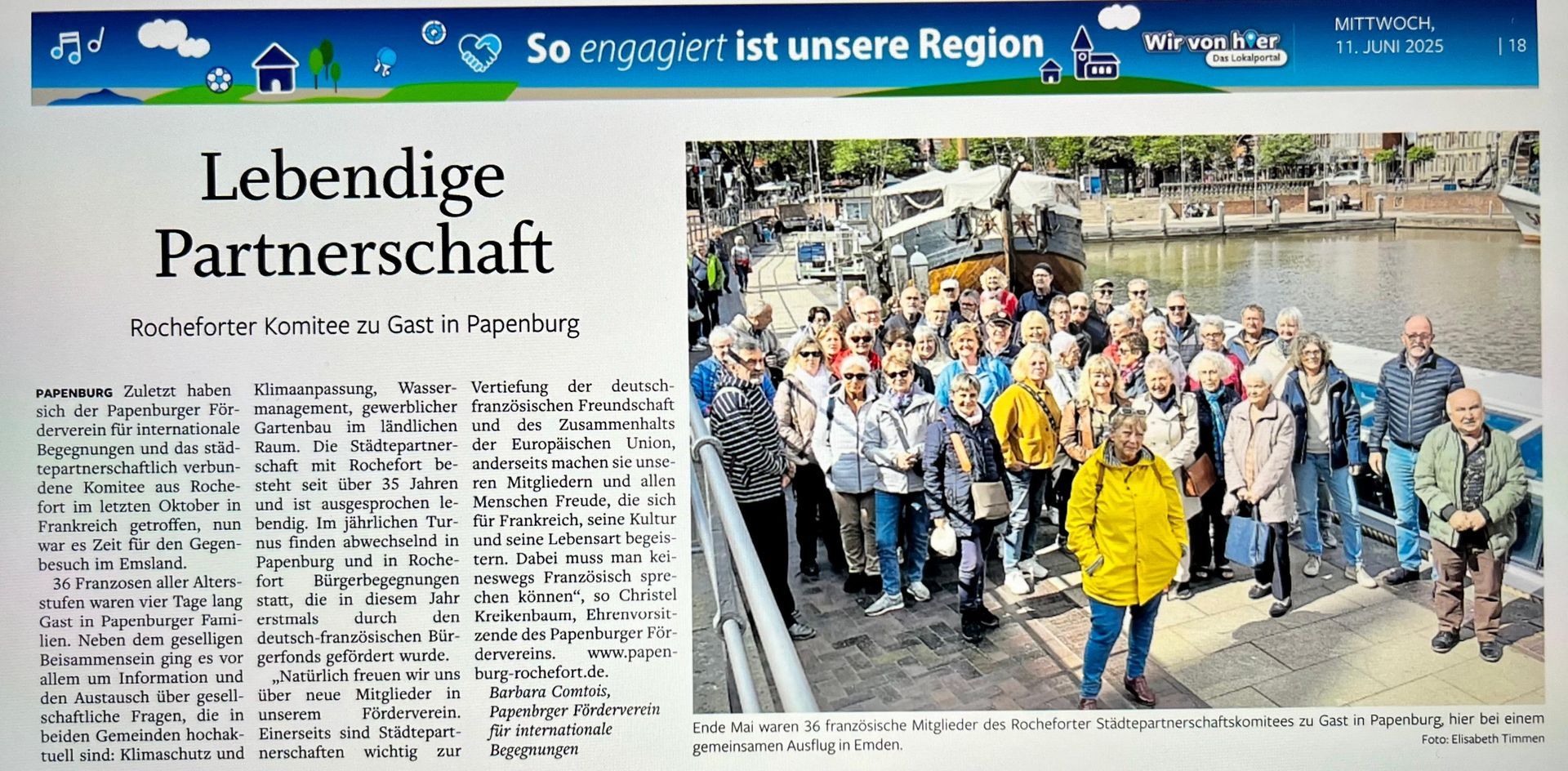 Über einen Zuschuss der Sparkasse Emsland in Höhe von 500 Euro für die Vereinskasse freut sich der Förderverein für internationale Begegnungen Papenburg. Die Summe soll insbesondere der Jugendarbeit des Vereins zugutekommen. Ehrenvorsitzende Christel Kreikenbaum betont: „Dieser Zuschuss kommt zur richtigen Zeit. Wir wollen uns vermehrt auf die Jugendarbeit fokussieren und zukünftig auch eine Jugendvertreterin in unseren Vorstand aufnehmen.“ Seit über 35 Jahren widmet sich der Förderverein der städtepartnerschaftlichen Verbindung mit dem französischen Rochefort, aber auch der Unterstützung von Austauschmaßnahmen von Schulgruppen und Klassen der Papenburger Schulen.